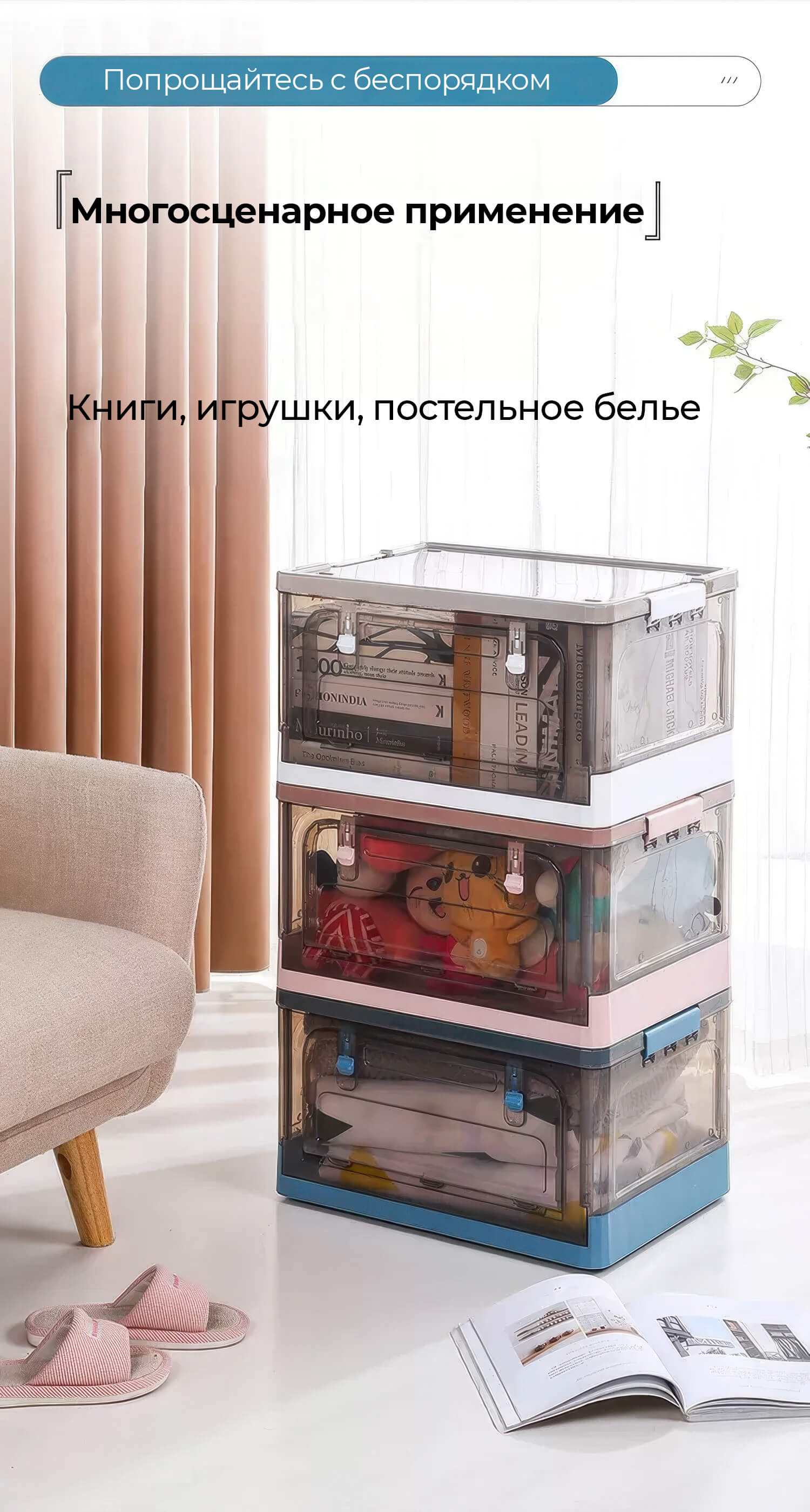 Пластиковая коробка с крышкой надежно защищает вещи от пыли и влаги, сохраняя их в чистоте. Прочная конструкция выдерживает нагрузку, а колесики обеспечивают легкость передвижения. Благодаря складной конструкции ящик удобно хранить, когда он не используется.
